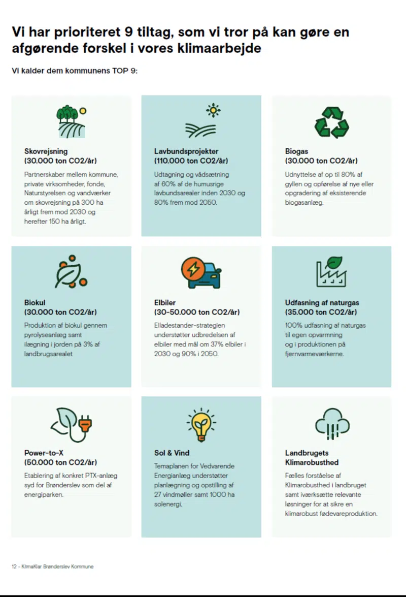 Den 31. maj vedtog et enigt Brønderslev Byråd den klimaplan, som skal hjælpe kommunen med at nedbringe CO2-forbruget med 70% frem mod 2030 sammen med alle de andre kommuner, regioner og staten. I Brønderslev Kommune har man valgt at lægge fokus på nogle af de sektorer, der udleder meget CO2. Det er bl.a. landbruget og transportsektoren. Kommunen er nu officielt certificeret som DK2020-kommune.